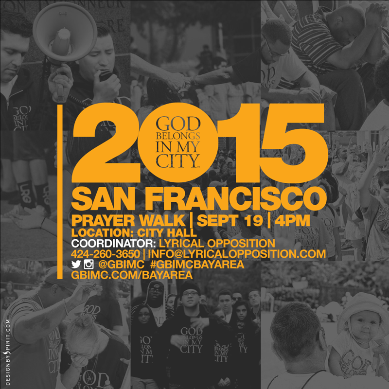 We are proud to introduce our new partnership with New York's GBIMC (God Belongs In My City). We have worked the past week or two in getting together to bring the GBIMC Prayer Walk to the Bay Area. We finally made it happen and agreed to bring it here on September 19, 2015, at 4pm, starting at City Hall. More information can be found at http://www.gbimc.com/bayarea. The prayer walk will be starting in front of San Francisco City Hall, then we will be walking through the streets of San Francisco praying for the city's landmarks, police stations, nightclubs, music venues, churches, etc. It will be an estimated 1.5-2 mile walk around the SoMa District and Tenderloin areas. Everybody is welcome, feel free to join us in unity and taking action in our cities.