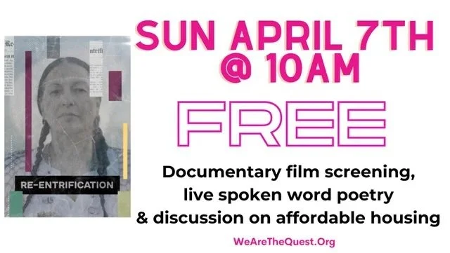 Join us at The Quest for an exciting in-person event! We invite you to be a part of an eye-opening documentary film screening called Re-Entrification. This thought-provoking documentary explores the complex issues of urban development and gentrification in our modern society with beautiful spoken word.